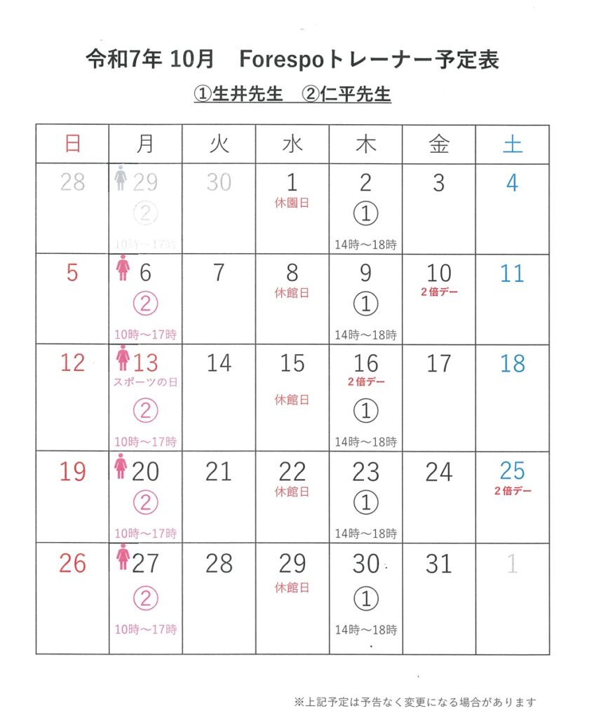 スポーツジムForespo で指導していただくトレーナーさんのスケジュールです。