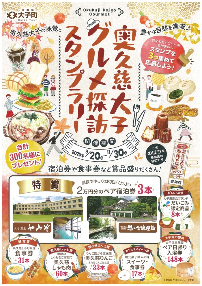 4つの異なるカテゴリー「奥久慈しゃも料理」・「奥久慈りんご」・「大子町農産品ブランド「だいごみ」認定商品」・「カフェ&スイーツ」のうち3種類を味わって、スタンプを集めて応募すると、抽選で素敵な賞品が当たるスタンプラリー!