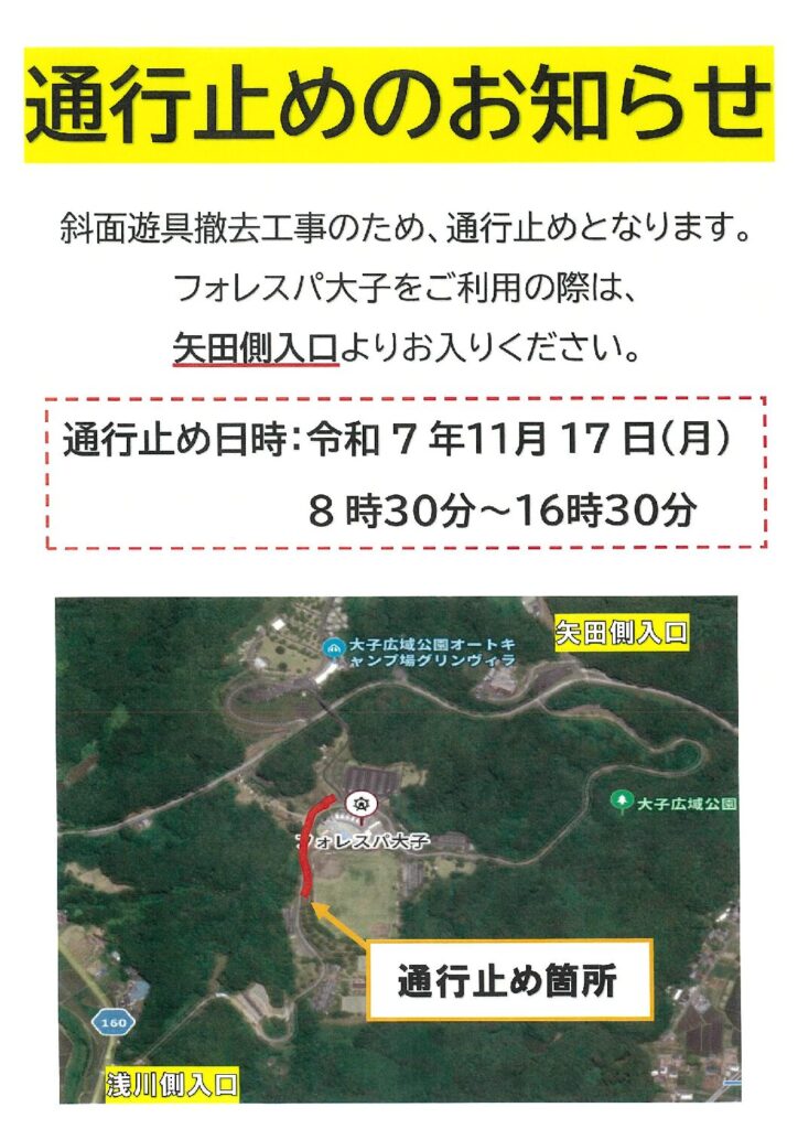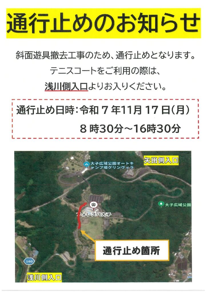 斜面遊具撤去工事のため、公園内一部通行止めのため下記のように、お客様にはご利用いただけるようご理解ご協力をお願いいたします。